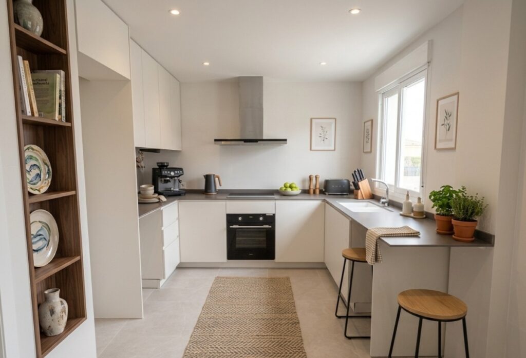 Reduce aproximadamente un 30% de los elementos en cada estancia: muebles, decoración, libros… y también en armarios y cajones (los compradores suelen abrirlos). Menos cosas significa espacios más amplios, ordenados y atractivos.